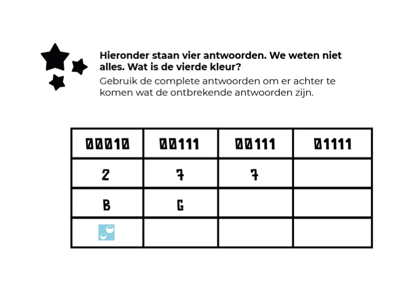 Tijdens de les komen een aantal puzzels aanbod. Deze puzzels en de antwoorden kan je vinden in de bijlage. Deze puzzels kunnen worden geprint en uitgedeeld wanneer ze in de quest worden gevraagd, maar ze kunnen ook worden opgelost vanaf het digibord.