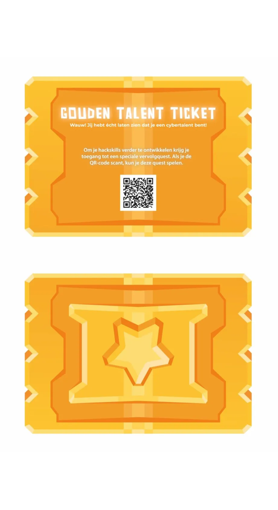 Aan het einde van deze quest kan de leerkracht ‘Gouden Tickets’ uitdelen aan leerlingen die mogelijk talent hebben voor hacken. Op het ticket staat een verwijzing naar de HackShield Academy, waar kinderen hun hacktalenten verder kunnen ontwikkelen. Zie bijlage 1 en 2 voor een printbare versie van de Gouden Tickets en de ouderbrief.